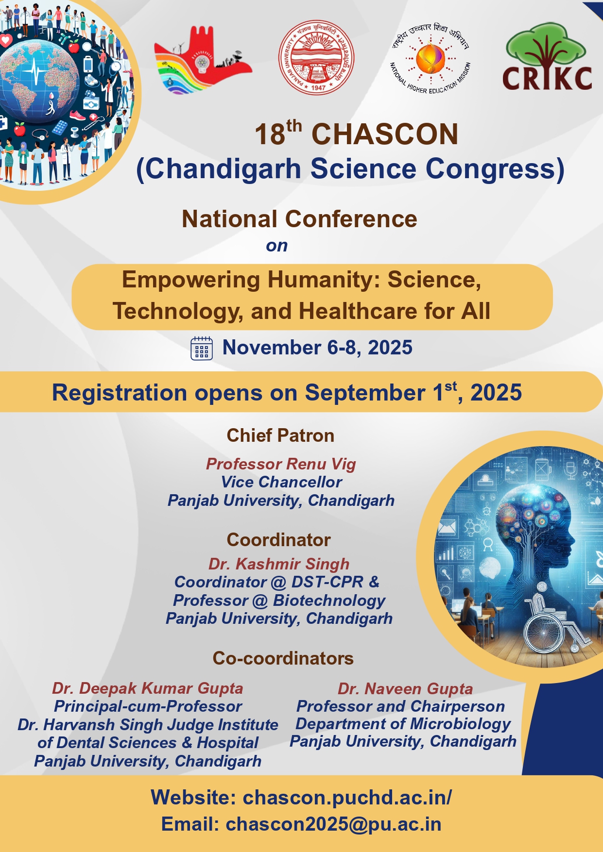 The 18th Chandigarh Science Congress (CHASCON) will take place at Panjab University from November 06 – 08, 2025. Introduced in 2007, CHASCON has grown into a major national conference that brings together young researchers, experienced faculty, industry professionals, and policymakers from across India and beyond. CHASCON provides a platform for sharing research, exchanging fresh ideas, and finding innovative scientific and technological solutions to realworld problems. This year’s theme, “Empowering Humanity: Science, Technology, and Healthcare for All,” puts the spotlight on the crucial role of scientific discovery and technological advancements in improving lives and ensuring access to quality healthcare for everyone.